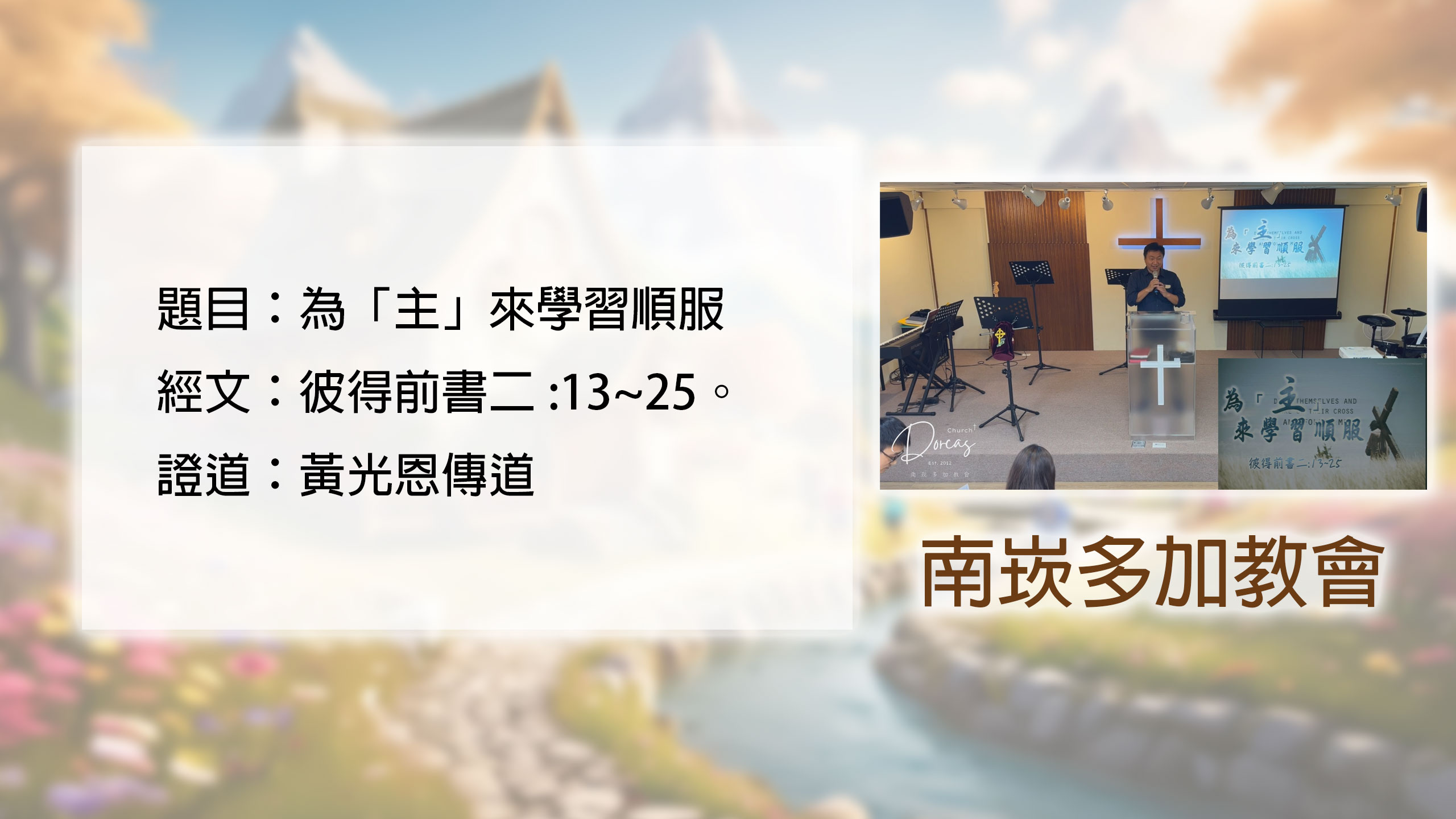 南崁多加教會的黃光恩傳道,透過**《彼得前書》二章13至25節**的經文,為我們深入剖析了一個超越個人情感的順服觀——為「主」來學習順服。這不單是一種行為,更是一種深刻的屬靈操練。